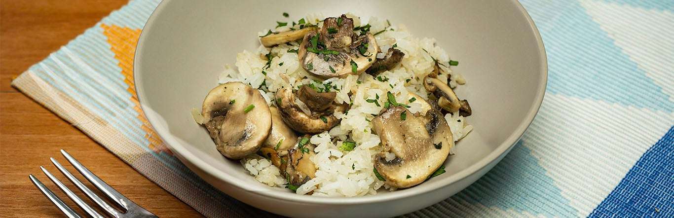 Para preparar los champiñones: En una sartén, derretir la mantequilla y saltear los champiñones por 3 minutos, mezclar hasta integrar bien; adicionar los champiñones a la olla del arroz y el perejil finamente picado; revolver hasta integrar, retirar del fuego.