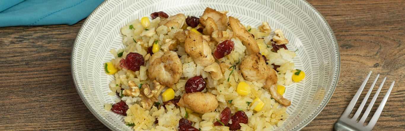 Adicionar los arándanos NATURE ́S HEART®, el maíz y el perejil; sofreír 1 minuto más, agregar el sobre de BASE PARA CHOP SUEY MAGGI® y el agua, revolver para integrar bien. Cocinar por 5 minutos más o hasta que hierva y espese. Por último, adicionar el arroz y mezclar para integrar bien.